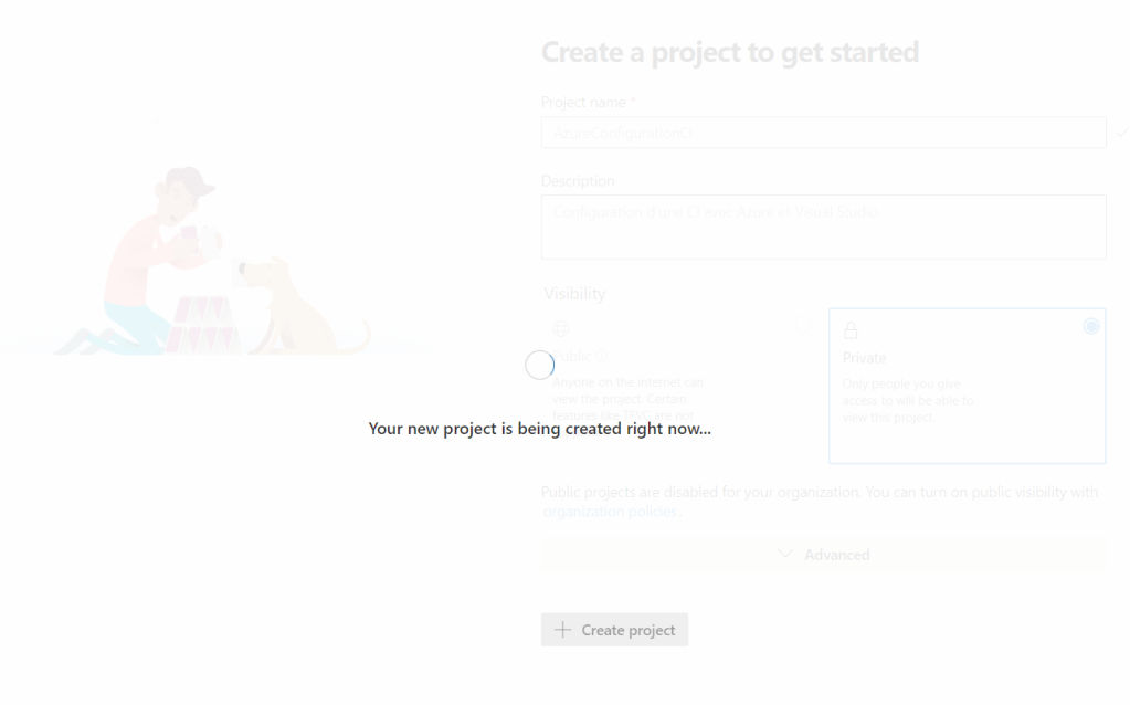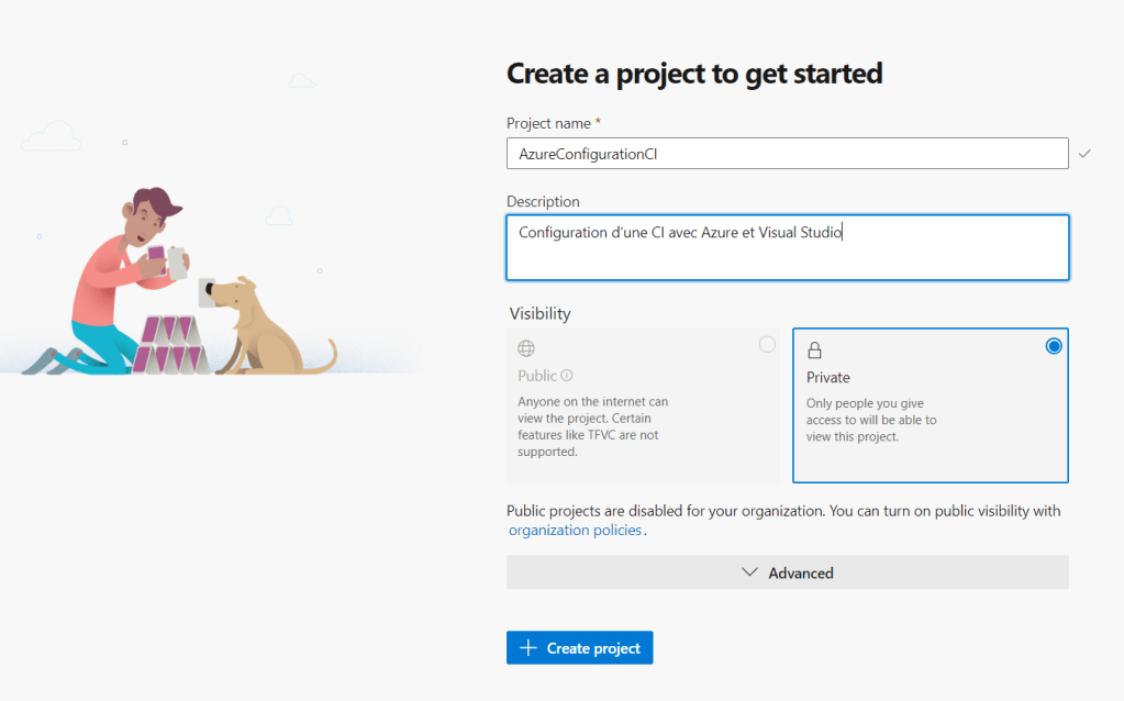Connectez-vous à Azure DevOps avec votre compte et créez un nouveau projet :