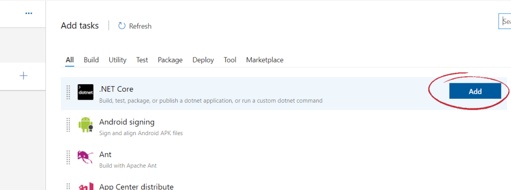 Dans la partie Agent Specification, selectionnez windows-latest. Ensuite cliquez sur Add a task to Agent job 1, ajoutez la task .NET Core et paramétrez comme ci-dessous :