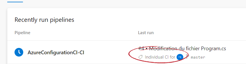 Dans Visual Studio, modifiez un élément du code et envoyez cette modification dans le repository. Vous verrez alors que la pipeline se lancera automatiquement pour intégrer vos modification :