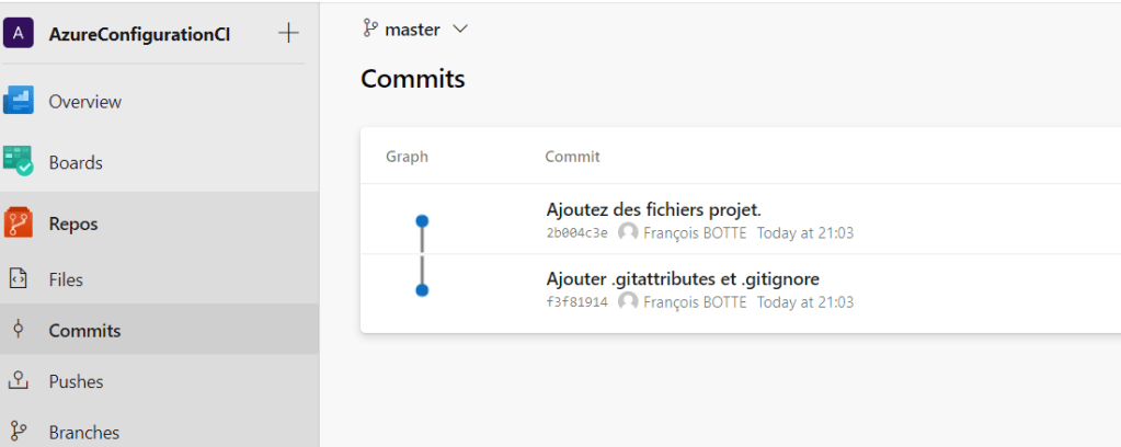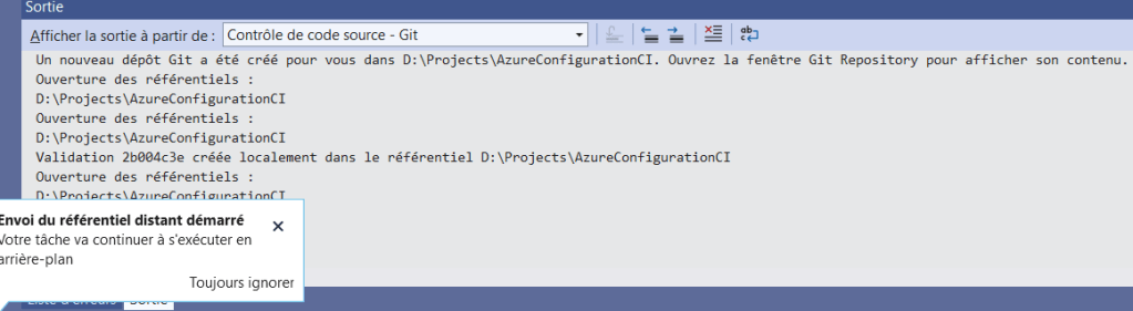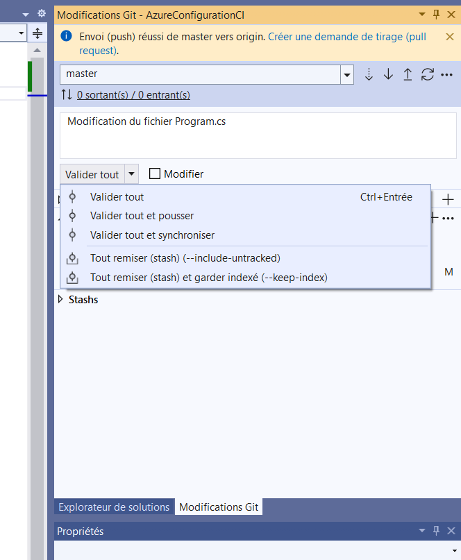 A cette étape, vous pouvez constater que votre projet Visual Studio est bien connecté à votre Repos Git sous Azure :