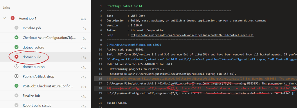 Votre pipeline d’intégration continue est correctement configurée. A chaque modification et envoi de code sur le repository, la pipeline s’exécutera. Si une erreur de compilation se produit, alors la tache de compilation sera en échec avec le détail du problème :