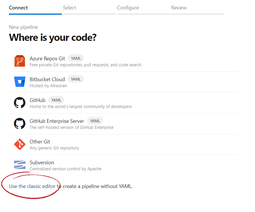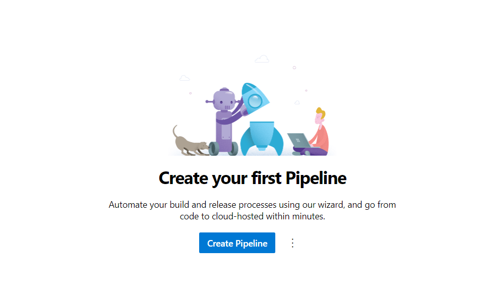 Cliquez sur le menu Pipelines et créez une nouvelle pipeline. Sélectionnez Use the classic editor et sélectionnez votre projet. Cliquez sur Continue et sélectionnez Empty Job :