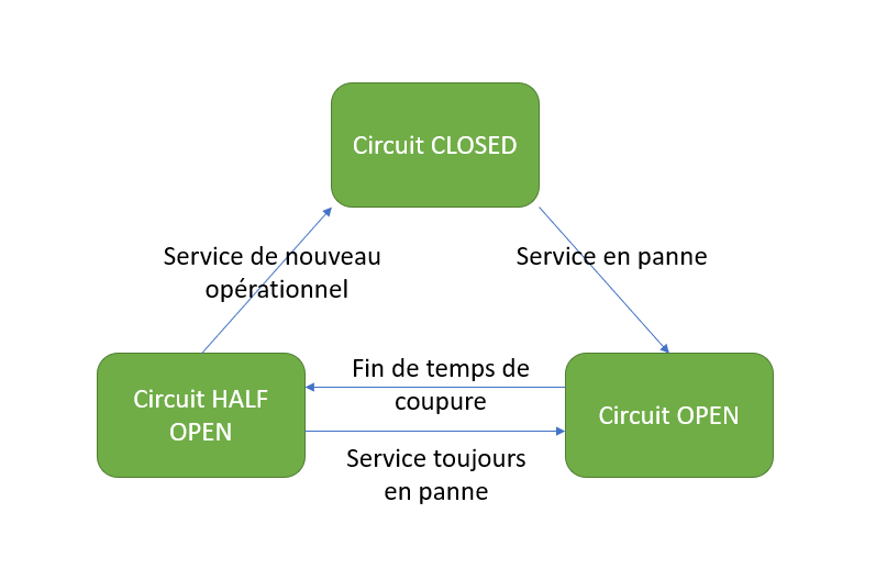 Lorsque le statut du circuit est CLOSED, tout fonctionne correctement. En cas d’erreurs (dans notre exemple : 1), le circuit passe en OPEN est applique la stratégie choisie pendant le temps demandé (dans notre exemple 20 secondes). Une fois le temps écoulé, le circuit vérifie si pas d’erreur et revient au statut CLOSED ou OPEN suivant le cas.