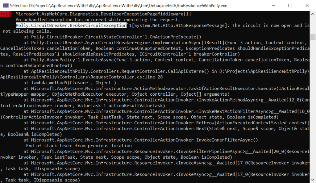 Exécutez les projets et en cas d’erreurs, refaite immédiatement un appel à la méthode. Vous constatez alors une erreur de type Polly.CircuitBreaker.BrokenCircuitException et surtout, vous constatez que l’appel n’est pas exécuté côté ApiRessourcesExternes pendant 20 secondes :
