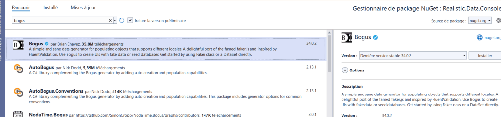 Installez le package Bogus et configurez la class Program.cs comme ci-dessous :