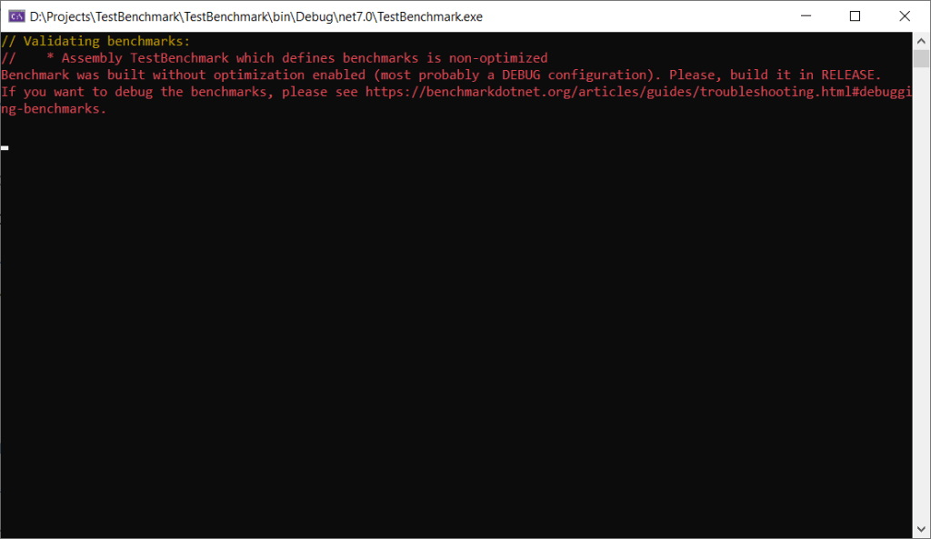 Si vous exécutez le code ainsi vous aurez un message d’erreur vous indiquant que les benchmarks doivent être fait en mode Release :