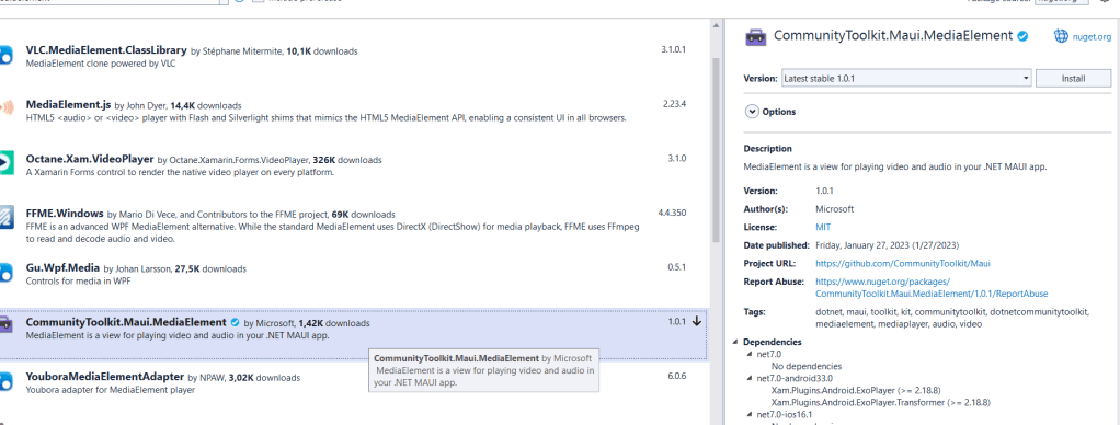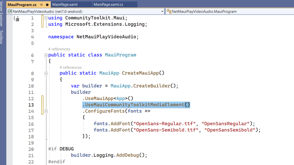 Dans votre projet .Net MAUI, installez le nuget CommunityToolkit.Maui.MediaElement (Microsoft à eu la bonne idée de séparer ce package du package CommunityToolkit.Maui) et configurez MauiProgram.cs comme ci dessous :