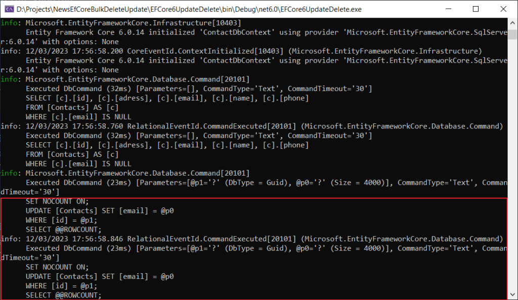 Avec EF Core 7, si nous reprenons le même exemple que ci-dessus mais en utilisant les méthodes ExecuteUpdateAsync et ExecuteDeleteAsync comme ci dessous :