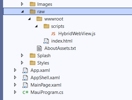 Let’s add web content to our project, specifically a file named _index.html_ and its HybridWebView.js. These files should be in raw format, located in your project directory Resources\Raw\wwwroot as shown below: